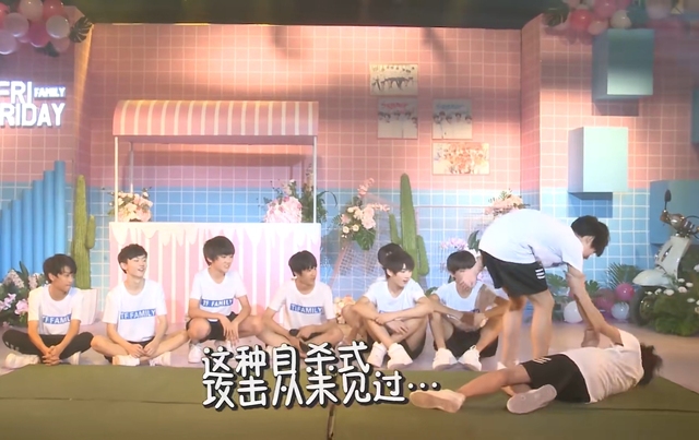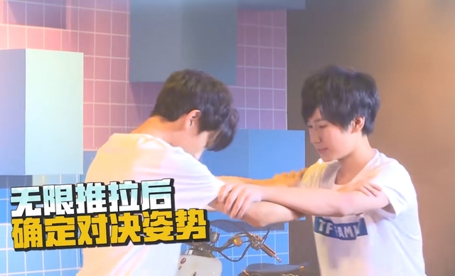 丁程鑫把张真源拉到垫子中间。然后用力把它放倒压住他。这个时候敖子逸快速数秒。