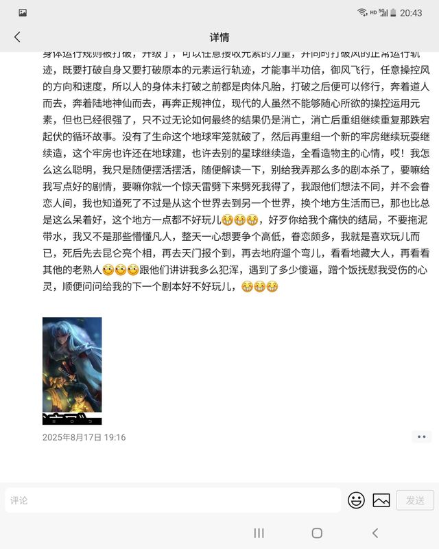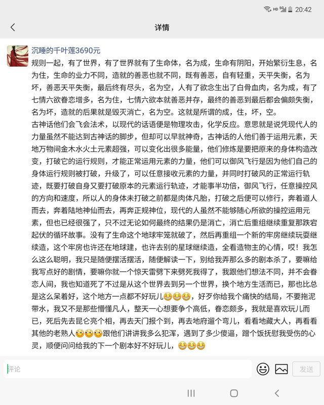 古神话他们会飞会法术,以现代的话语便是物理攻击,化学反应。意思就是说凭现代人的力量虽然不能达到古神话的脚步,但却可以早就神奇,古神话的人他们善于运用元素,天地万物间金木水火土元素超强,可以变化出很多能量,他们修炼是要把原来的身体构造改变,打破它的运行规则,才能正常运用元素的力量,他们可以御风飞行是因为他们自己的身体运行规则被打破,升级了,可以任意接收元素的力量,并同时打破风的正常运行轨迹,既要打破自身又要打破原本的元素运行轨迹,才能事半功倍,御风飞行,任意操控风的方向和速度,所以人的身体未打破之前都是肉体凡胎,打破之后便可以修行,奔着道人而去,奔着陆地神仙而去,再奔正规神位,现代的人虽然不能够随心所欲的操控运用元素,但也已经很强了,只不过无论如何最终的结果仍是消亡,消亡后重组继续重复那跌宕起伏的循环故事。没有了生命这个地球牢笼就破了,然后再重组一个新的牢房继续玩耍继续造,这个牢房也许还在地球建,也许去别的星球继续造,全看造物主的心情,哎!我怎么这么聪明,我只是随便摆活摆活,随便解读一下,别给我弄那么多的剧本杀了,要嘛给我写点好的剧情,要嘛你就一个惊天雷劈下来劈死我得了,我跟他们想法不同,并不会眷恋人间,我也知道死了不过是从这个世界去到另一个世界,换个地方生活而已,那也比总是这么呆着好,这个地方一点都不好玩儿[坏笑][坏笑][坏笑],好歹你给我个痛快的结局,不要拖泥带水,我又不是那些懵懂凡人,整天一心想要争个高低,眷恋颇多,我就是喜欢玩儿而已,死后先去昆仑亮个相,再去天门报个到,再去地府遛个弯儿,看看地藏大人,再看看其他的老熟人[奸笑][奸笑][奸笑]跟他们讲讲我多么犯浑,遇到了多少傻逼,蹭个饭抚慰我受伤的心灵,顺便问问给我的下一个剧本好不好玩儿,[坏笑][坏笑][坏笑]