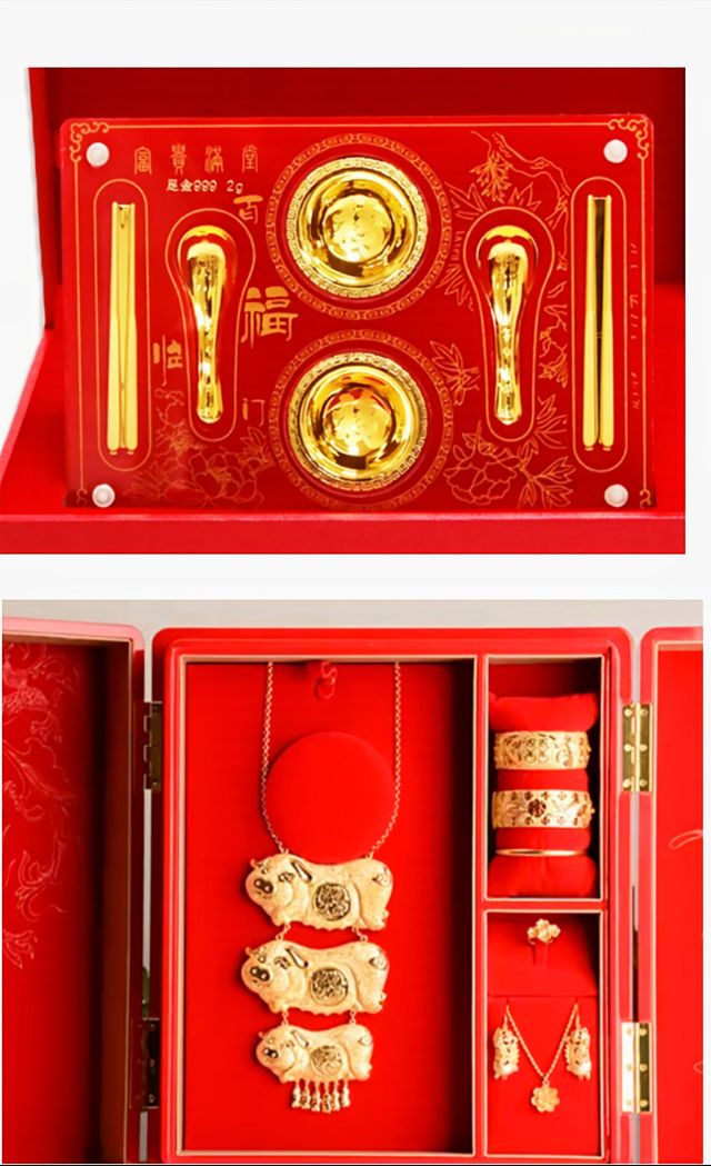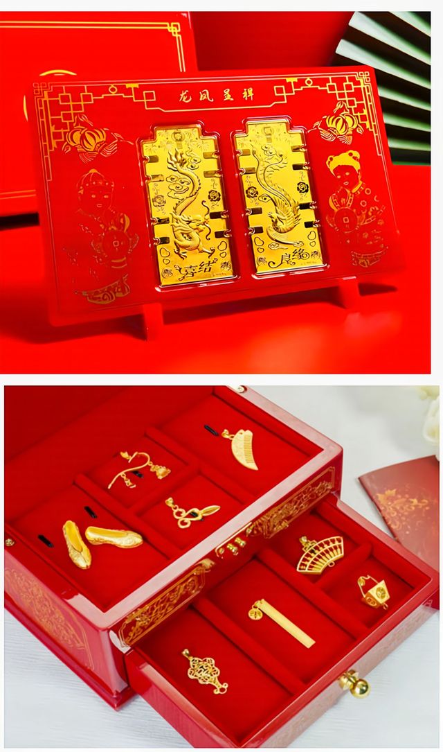 打开箱子一看,里面首先映入眼帘的是一个礼单,那礼单平平整整地躺在箱子上方,仿佛一位庄严的使者。然后是新娘婚纱以及配套首饰,婚纱洁白如雪,绽放着梦幻般的光泽,配套首饰犹如繁星点缀在银河之中,璀璨耀眼。再往下是四个颜色款式各异的名牌包,它们像是四颗散发着独特魅力的宝石,静静地等待着被人发现。随后贞子又拿出了四套精美的首饰,那首饰精致绝伦,犹如艺术大师手中最得意的作品。在往下是两个黄金套盒。箱子最底部还有礼金,那一沓沓礼金整齐地摆放着,就像一座稳稳的金山,散发着诱人的光芒。