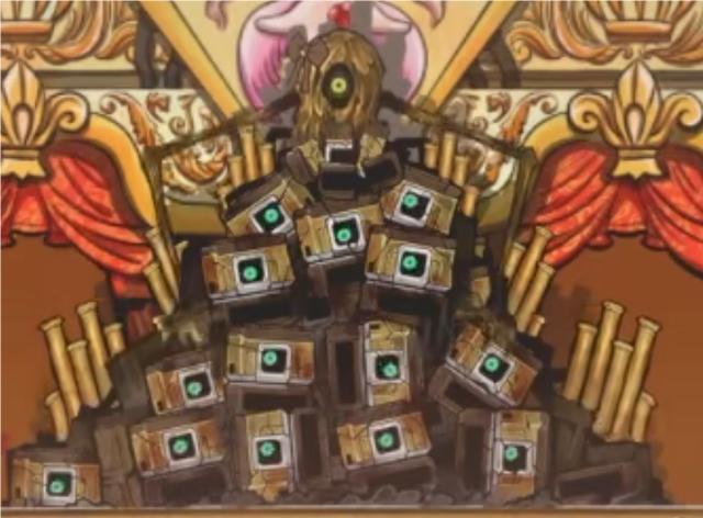 背后有引擎声轰鸣,上方的蒂佩瑟用那双机械手臂将其下方堆成一座山的蒂佩瑟残骸不断聚拢,所有的机械眼睛都在死死的盯着监控的方向