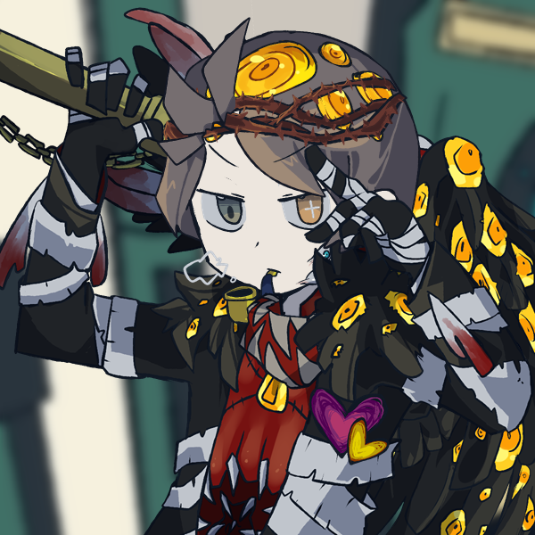 剑柄如同正义裁决者一般是金色的,其上如同终末鸟的那张巨口一般紧紧咬着从中伸出来的由一根根黑色羽毛所构成的剑刃,黑色的羽毛夹缝之中又有无数那熟悉的金色眼睛