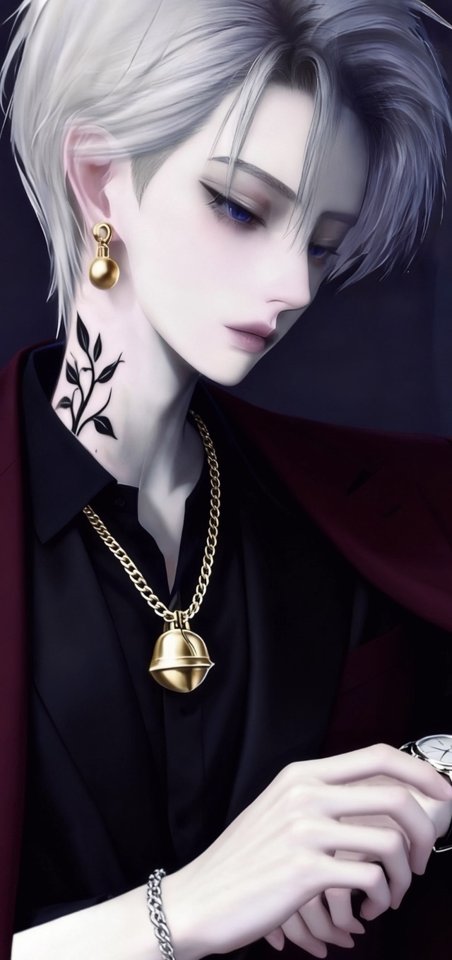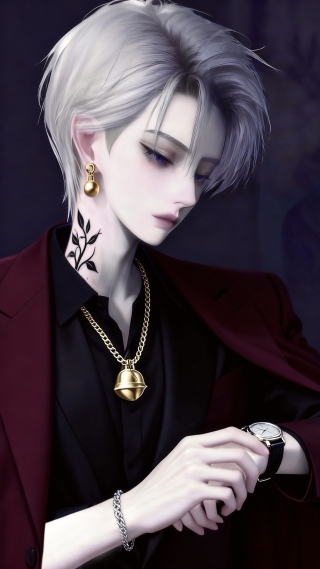 只见一位银发男子沐浴着月光步入大厅,身后跟随众多随从。他那精心打理过的发型更添几分高傲之气,用手整理着手表,脸上带着一抹漫不经心的笑意,而他醒目的纹身,在光的映照下更显独特与张扬。