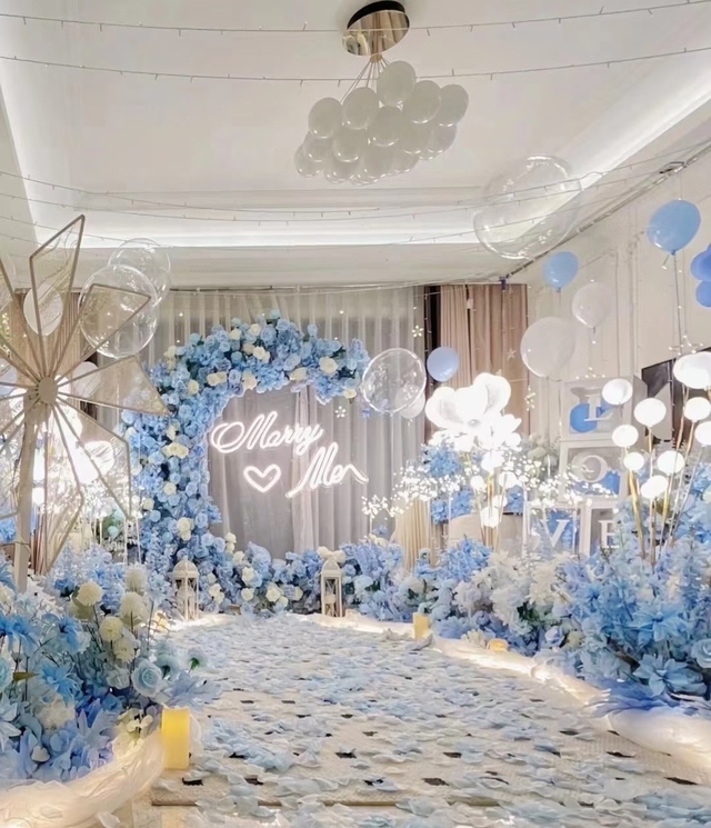 大婚前一周张雨杰就开始布置大婚场地:主题:璀璨如星河的蓝色水晶婚礼,(水晶遇上冰蓝色,一切都变得更加温和,为现场赋予了梦幻的气质)成千上万颗水晶形成的吊顶星河鳞次栉比水晶自然垂下闪耀着。银白色的灯光,蓝色的花艺好像银河撒下的光辉,落入梦境一般美好。透明的亚克力装饰搭建的拱门。法式的有圆月,有星座,云顶纱组成的吊顶