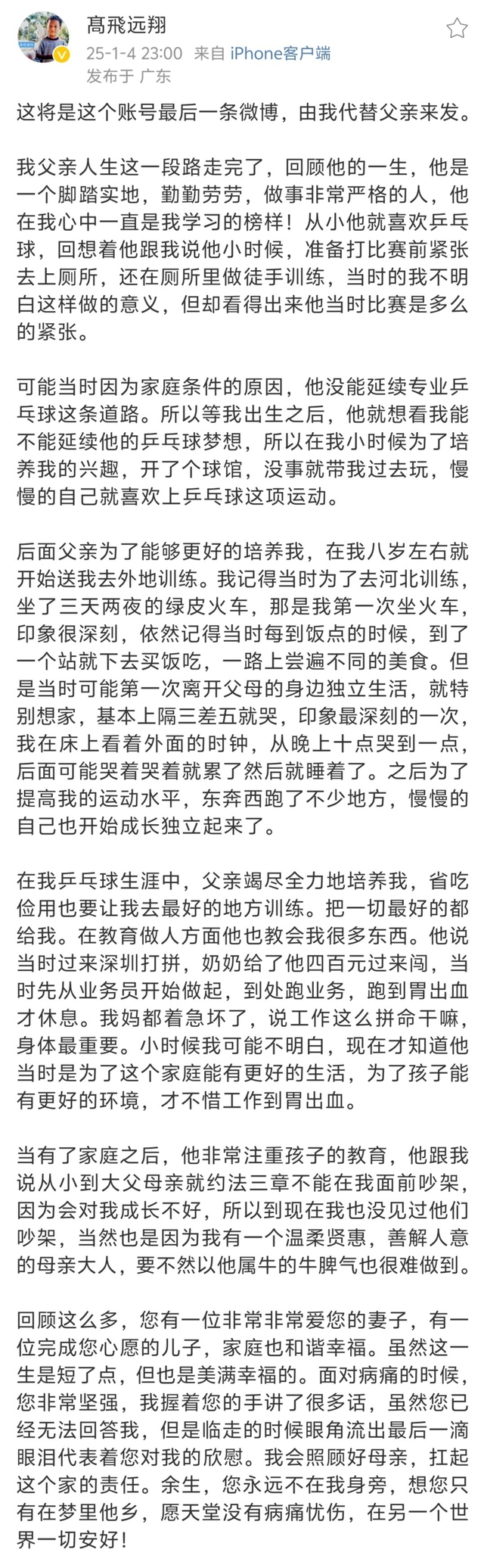 1月4号的时候高远在微博平台用父亲的账号发布微博
