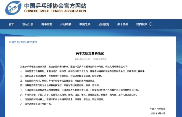 3月11日国乒发了,文明观赛的公告和视频