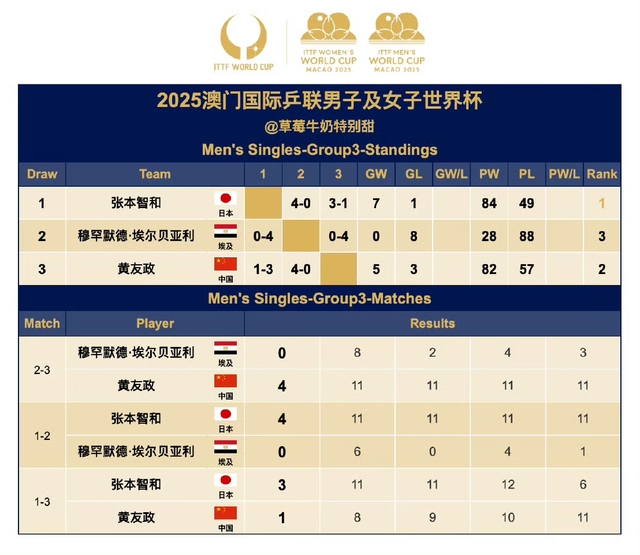 2025澳门国际乒联男子及女子世界杯男单Group3:张本智和晋级第二阶段