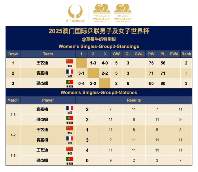 2025澳门国际乒联男子及女子世界杯女单Group3:袁嘉楠晋级第二阶段