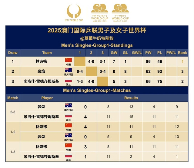 2025澳门国际乒联男子及女子世界杯 男单Gruop1:林诗栋晋级第二阶段