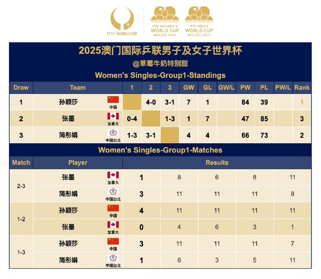 2025澳门国际乒联男子及女子世界杯女单Group1:孙颖莎晋级第二阶段