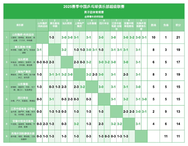 2025赛季中国乒乓球俱乐部超级联赛男团常规赛赛况 :
