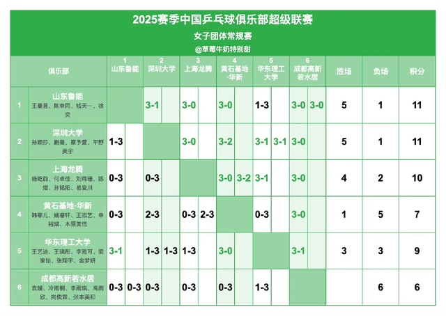 2025赛季中国乒乓球俱乐部超级联赛女团常规赛赛况 :