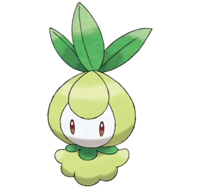 “娃娃”,草丛被拨开,一只草系宝可梦现身。它有着圆形的头,整体为浅黄色,条纹状的身体宛如洋葱一类植物的球根。脸上长着三根椭圆形的叶子,白色的面庞,游戏长且竖着的卵形褐色眼睛,脖子上有绿色托叶,下方的身体由五个粗短圆柱组成,其中两个像是手臂,两个像是腿。此时,它正用褐色的眼睛好奇地注视着黎子,那眼神中充满了纯真与好奇。而黎子和阿勃梭鲁也同样好奇地回望过去,一时间,空气仿佛凝固了一般。下一秒,记忆中便蹦出了它的信息。