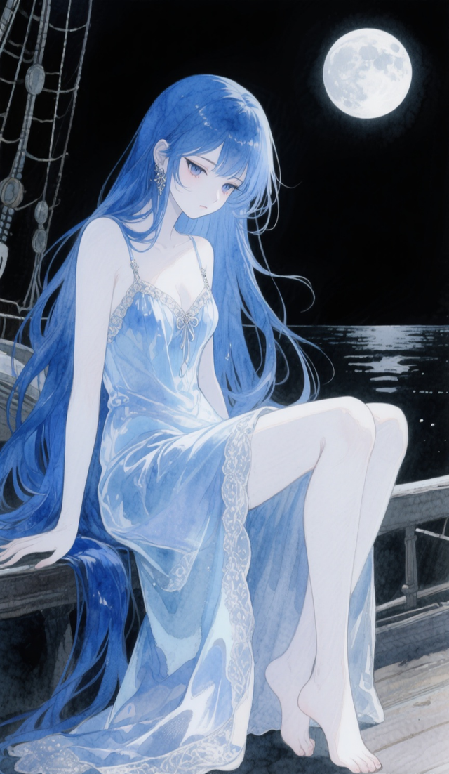 散落下的蓝头发,穿这睡裙坐在船边,月色将她照亮在身边