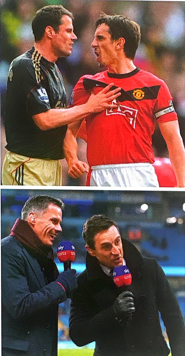 球员时期各为其主的卡拉格与加里内维尔则是球场上,针锋相对,退役后同为媒体职工的这对欢喜冤家,如今是默契拍照。