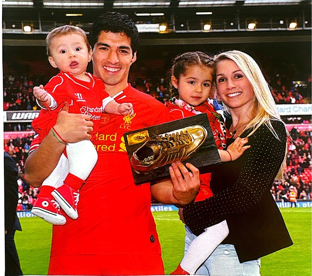 2014年5月18日,利物浦二比一击败纽卡斯尔联的亚军,季军收官战苏亚雷斯抱着儿子本杰明妻子索菲亚怀抱女儿德尔菲娜展示苏亚雷斯的英超赛季最佳射手奖杯。