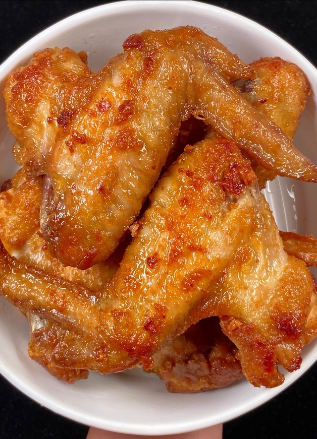 炸鸡做好了就放酱汁,然后放烤箱里烤小吃拼盘,蒜香鸡翅,奥尔良烤翅,空气炸锅里炸薯条,动作就这么有条不紊的进行了下去。