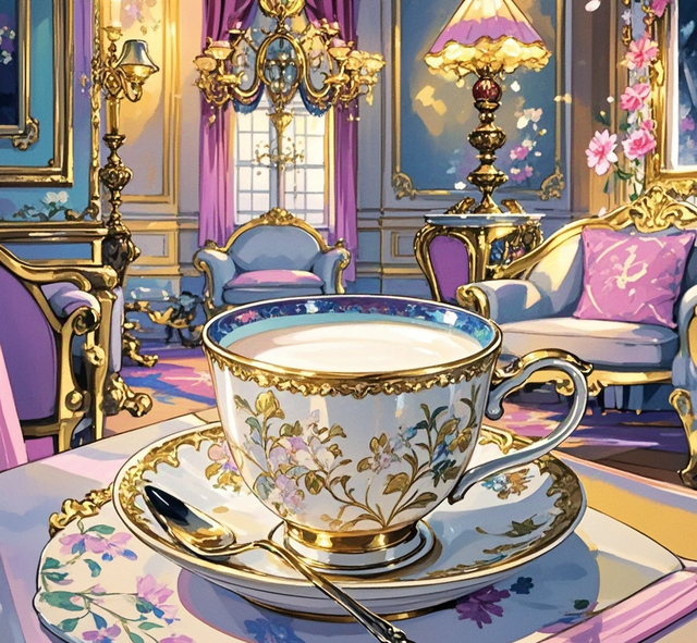她姿态优雅地端起桌上那造型别致、精美绝伦的法式茶杯,轻启朱唇,小心翼翼地抿了一口杯中的牛奶。