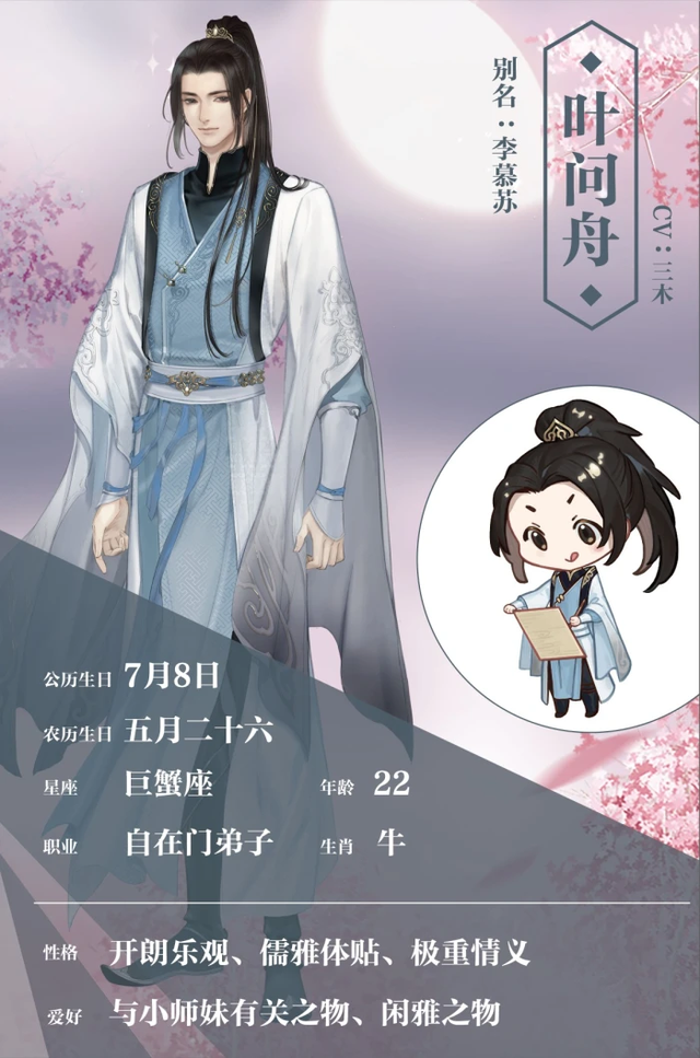 叶问舟叶问舟为三清山自在门"懒残大师"叶哀禅座下二弟子,自幼与小师妹一同长大,师兄妹感情深笃。他天资聪颖,擅长丹青之技与笛艺,武学一道也造诣颇深。为人淡泊名利,古道热肠,不慕世间荣华,尤喜闲云野鹤。毕生以“自在”二字为修习武学与心性的最高境界。因为小师妹身体虚弱,叶问舟一直对她怜爱有加;朝夕相处中,这份感情日益加深。