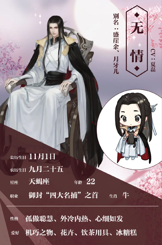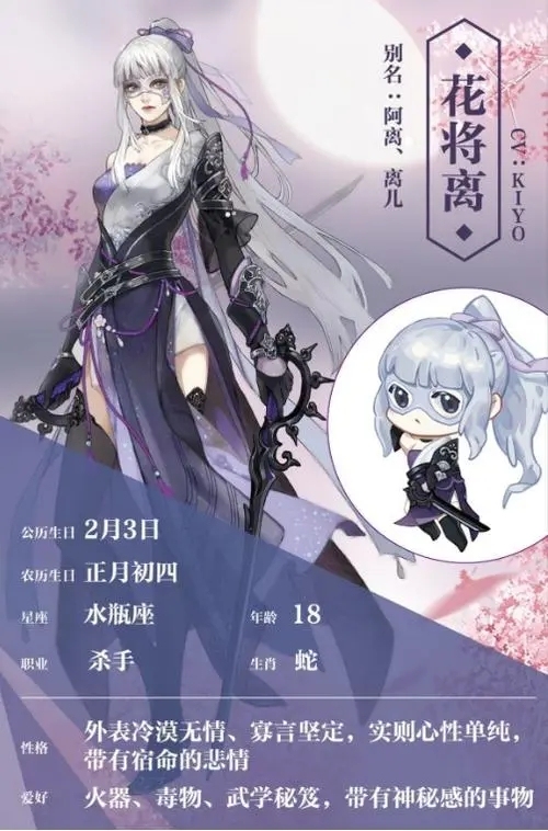 花将离花将离常年行踪不定,性格孤傲,生活孤僻,寡言少语,看上去冷若冰霜。她领受密令,四处寻找身上有蛊纹之人。她暂时还不知道这背后有什么秘密,一直按照自己被培养的性格和方式生活……她身上有一种命运的悲情,但实际上却心性简单,只是很多时候,她不知道如何去做