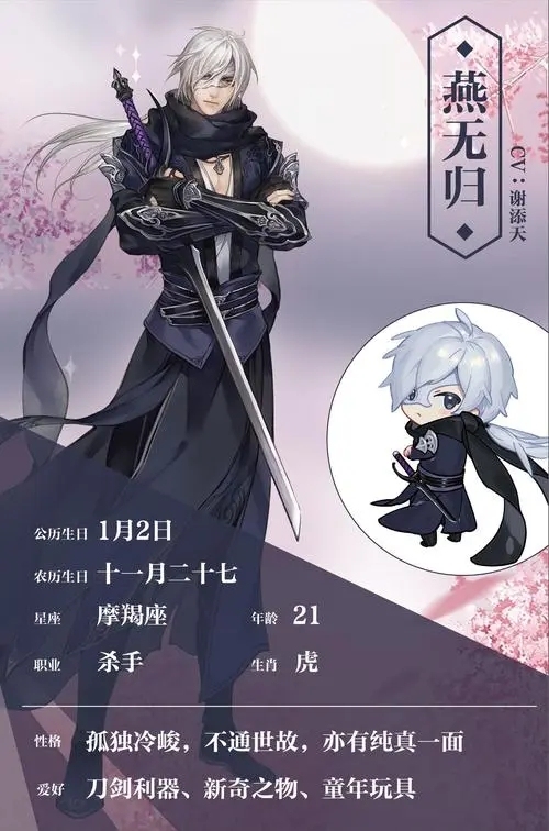 燕无归燕无归的身世和武功来历都神秘难测,只知他体质特异,不惧毒物,对危险的嗅觉也远较一般人灵敏。素不喜与人交往,常去的地方是一处高阔悬崖,朗月之夜,可他孤身立于悬崖之顶,身旁偶尔有巨狼陪伴。