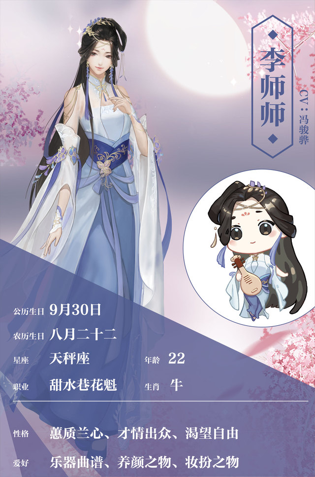 李师师李师师天生丽质,自幼容貌出众,有一副好嗓子,擅咏唱词曲。她未满十五岁,便是“人风流,歌婉转”,在甜水巷中独领风骚,高树艳帜。李师师凭借灵心慧质、才情出众,和出色的歌舞,闻名于京城大街小巷。天下文人雅士、公子王孙,莫不想一睹芳容。但李师师又常以笼中之雀自比,虽年华正好,风光无限,却难得自由。李师师有时极渴望离开笼子,像飞鸟一般自由自在