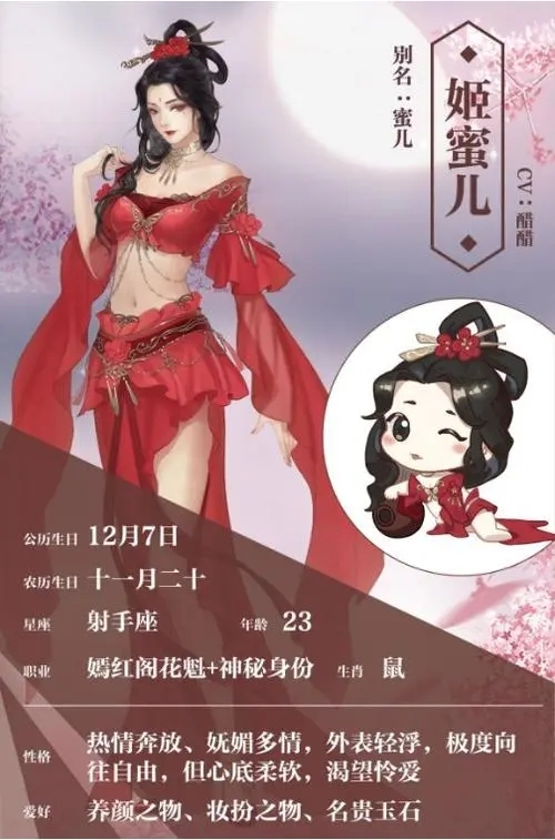 姬蜜儿宋朝的人们听说姬蜜儿,是从汴京城的甜水巷开始的。那时候,京城风言风语,四处传言甜水巷来了一位风情万种、妖娆魅惑的女子,歌声妩媚勾魂,舞姿曼妙绝尘,风头直追早已成名的李师师。但她虽在甜水巷成名,却无意于此,她生性放浪,不喜欢困在一个地方,于是便决意离开甜水巷。姬蜜儿希望有人能够触碰到自己心灵深处的感受,但又对此充满惶恐。