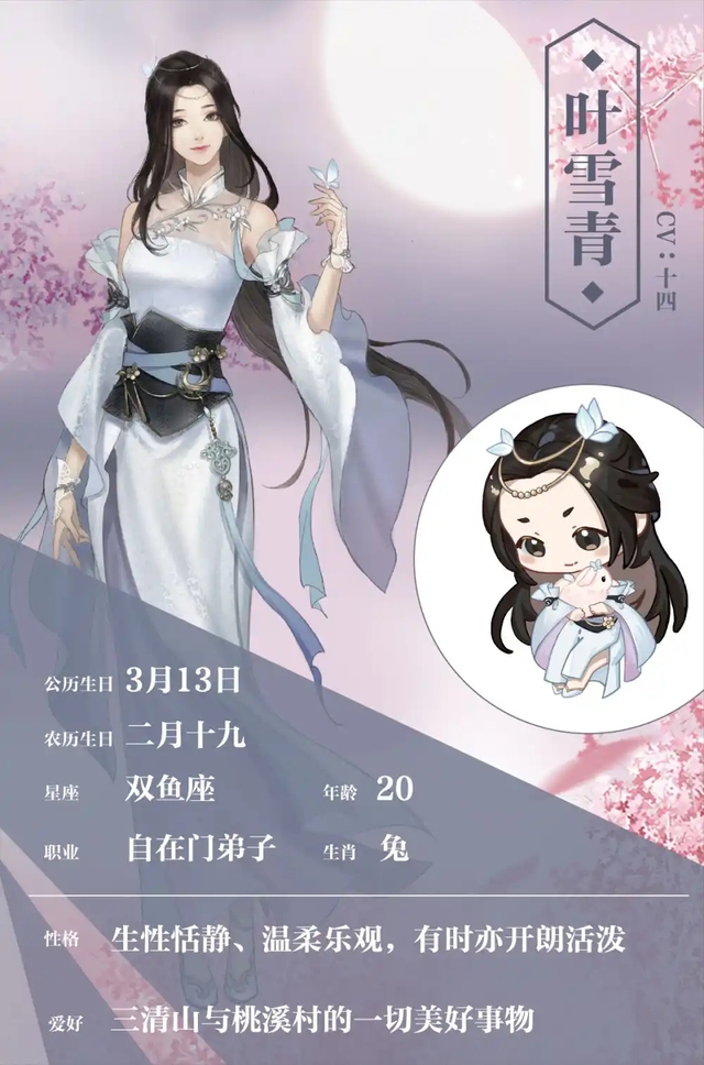 叶雪青叶雪青是三清山自在门"懒残大师"叶哀禅座下弟子,自幼在三清山长大,常年居于山上,生性恬静,很少下山,对三清山的一草一木都充满怜爱之情。平日里,她喜爱侍弄花草,亦时常与小动物为伴,或温柔爱抚,或吐露心声。但叶雪青也对外面的江湖充满期望,希望有朝一日也能仗剑江湖。
