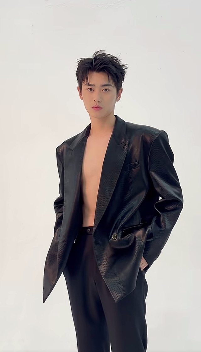 他的头发有一种自然随性的感觉,身着一套笔挺的黑色西装,彰显出他健美的体魄和挺拔的身姿,领口整齐地压在他结实的锁骨上,勾勒出他坚毅的面容,西装的颜色与他的深邃的眼眸相映成趣,让人忍不住多瞧几眼