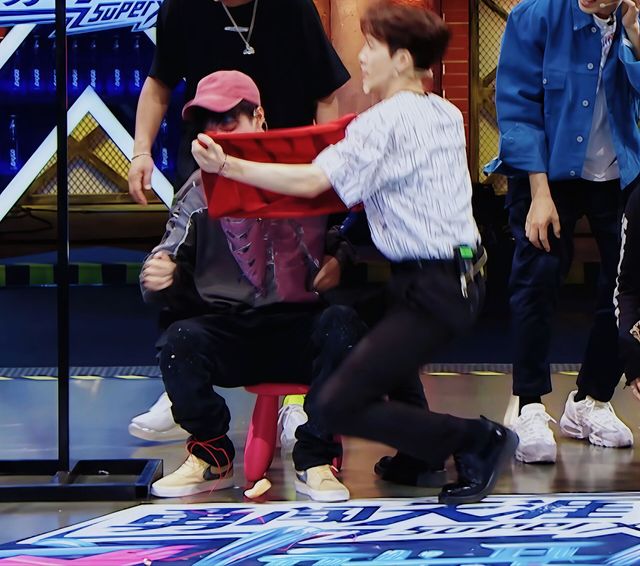 王嘉尔去到一博的后面顶着他,防止他摔倒,你站在一博的面前帮忙抓着杆子。