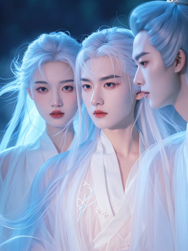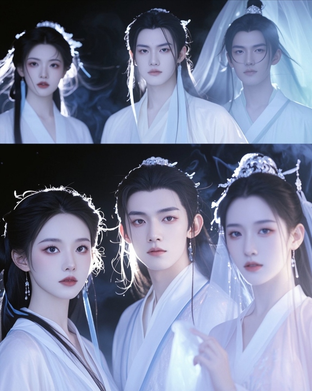萧暮,一身白衣胜雪,长发如瀑,手中紧握着一柄寒光闪烁的长剑。他站在灵瑶身旁,目光如炬,直视着那些幽冥使者,身上散发出一种不可侵犯的凛然正气。