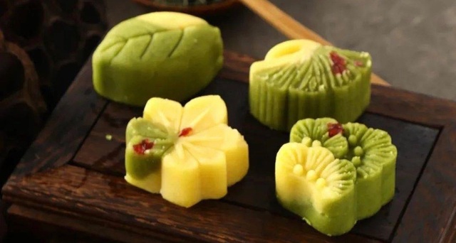 宫子羽凑进盘子中去看,就见里头是一个个绿黄相间的,各个型状的糕点。