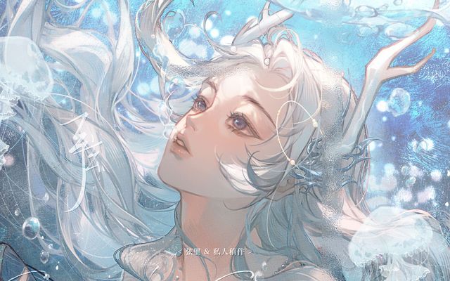 她的头发,原本从黑色的长直,渐渐化为了如同夜空中最纯净的银月之光,柔顺地垂落在肩头,女孩的肌肤细腻如玉,散发着淡淡的光泽,让人不禁联想到深海中最珍贵的珍珠。 此刻,她静静地坐在那里,周身环绕着蓝色调的梦幻气泡,每一个气泡中都藏着一个未知的故事,似乎在诉说着她不平凡的出身与命运。
