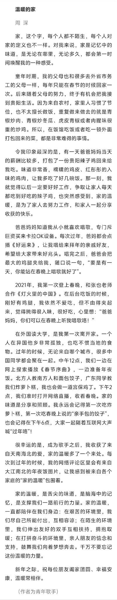 文章分享_【冯骥才、周深等人民日报撰文,畅谈春节团圆之味:温暖的家】_人民日报