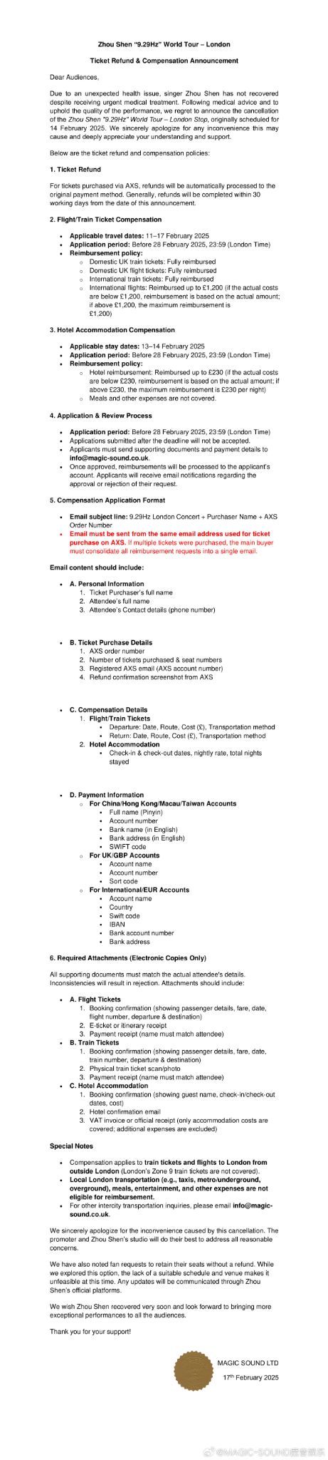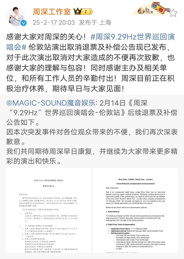 2月14日《周深“9.29Hz”世界巡回演唱会-伦敦站》退票及补偿公告发布。愿深深早日康复,期待下一次的相见!