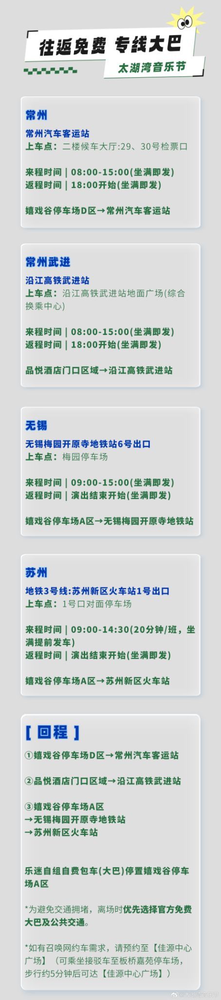 温馨提示:建议大家低碳绿色出行,为减少交通拥堵,请优先选择乘坐免费专线大巴、公共交通前往,并合理安排乘坐时间!