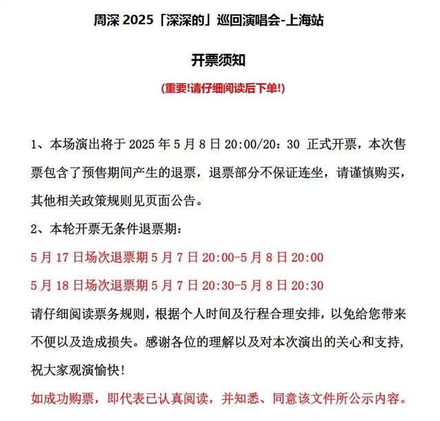 周深上海演唱会#将于2025年5月8日20:00/20:30 正式开/票,本次售/票包含了预/售期间产生的退/票,退/票部分不保证连坐,请谨慎购/买,其他相关政策规则见页面公告。