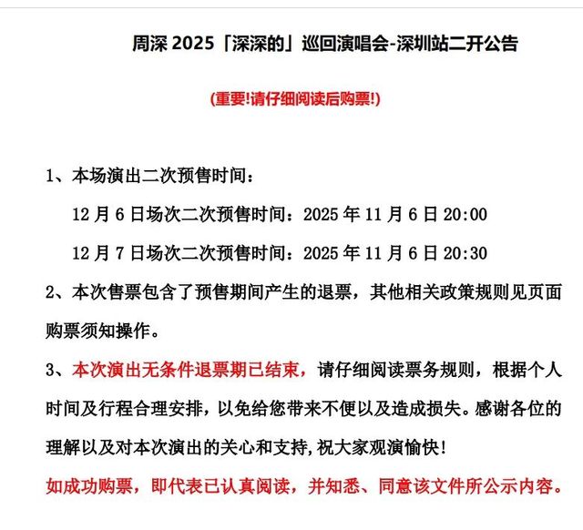周深2025「深深的」巡回演唱会深圳站将于11月6日晚20:00/20:30二次开/售!12月6日和12月7日两日连开,和周深@卡布叻_周深 相约深圳大运中心体育场!