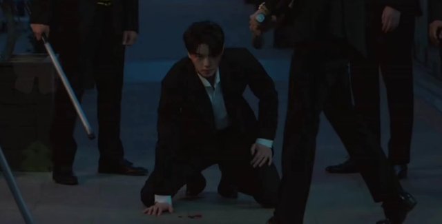 他和那些人斗争着,却不料一个黑衣人往他头上打了一棍。他跪在地上,眼神淡漠地望着面前那个人。
