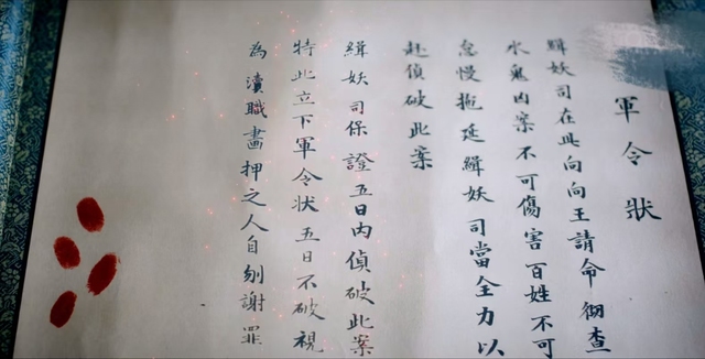 在缉妖司的议事厅里大家看着手里此桩案子的卷宗,这时卓翼宸和文潇发现了军令状的异样,军令状另一半空白页上面正在浮现出文字