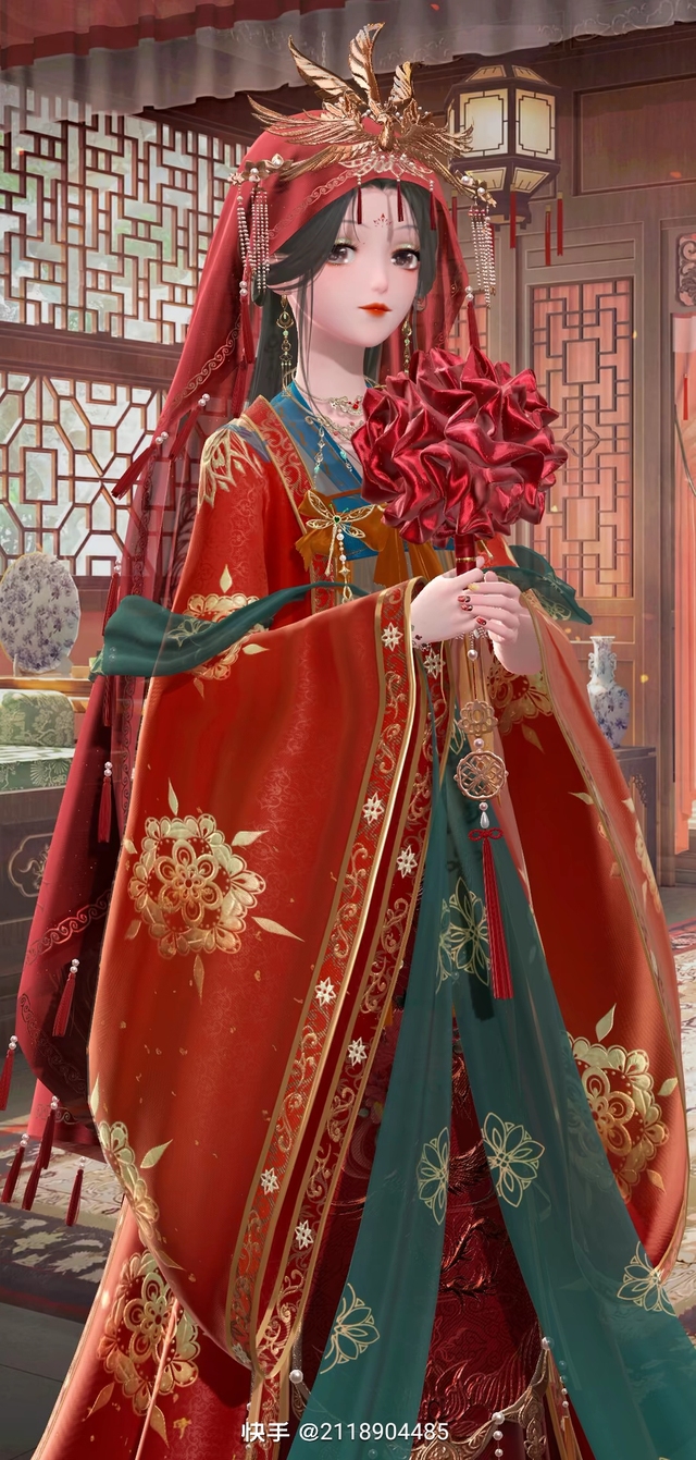 程瑶今日笑容就没有淡下过,穿着一身喜庆的红色婚服 ,手中握着调缎编织而成花束 ,黑色的头发间带着金色的凤冕。
