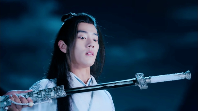魏无羡试探性地将蓝湛的剑推回鞘中。