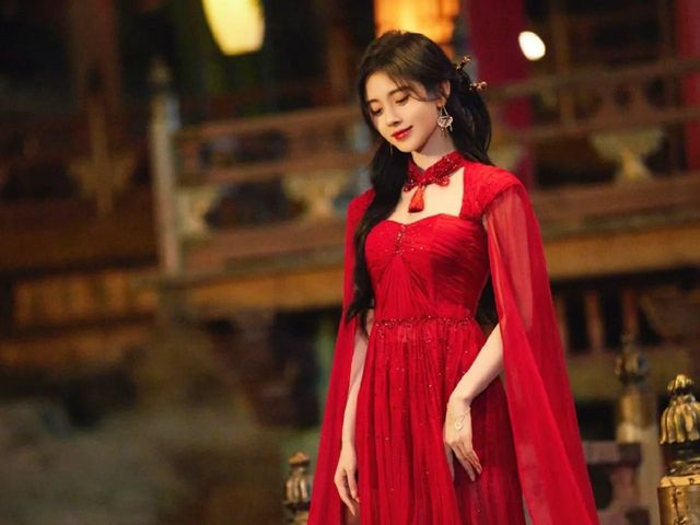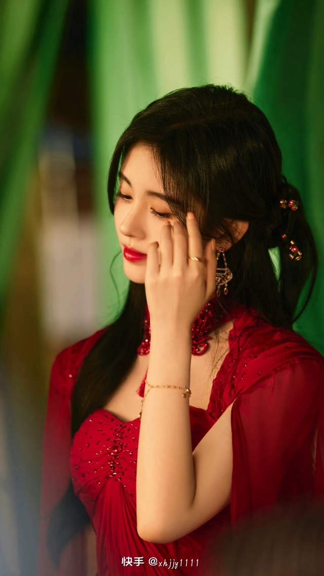 一位身着独特设计红裙的女子静静地站立着。她的裙摆如流云般轻柔地垂下,领口精致的细节如同细腻的笔触,勾勒出她的高雅气质。袖子采用半透视材质,若隐若现间增添了几分神秘感。她乌黑的秀发经过精心打理,几缕发丝轻轻垂落在肩头,耳畔点缀着精美的耳环,与发间的饰品相映成趣,更显其风采卓绝。周围温暖的灯光仿佛为她披上了一层金色的纱幔,让人不由自主地沉浸在这一幕温馨而又充满魅力的画面之中。