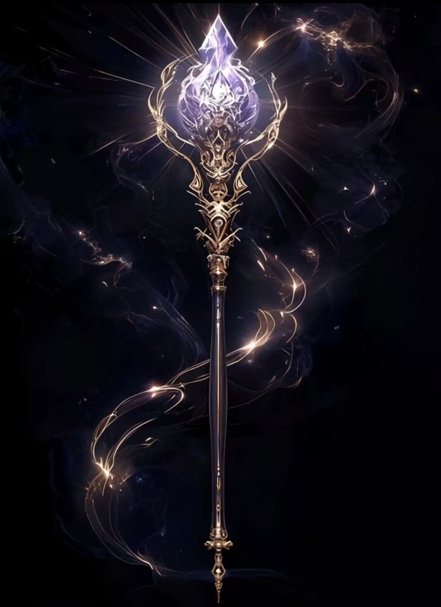 无渊权杖:暗域深渊中觉醒的法杖,紫金纹路在幽光里,缠绕成神秘符文,棱晶似封印着混沌的魔力,流光如暗焰在周遭腾跃,以怨灵的诅咒为核心,熔铸为器,凝视着虚空的扭曲,宣告被夺走的一切,必须偿还。