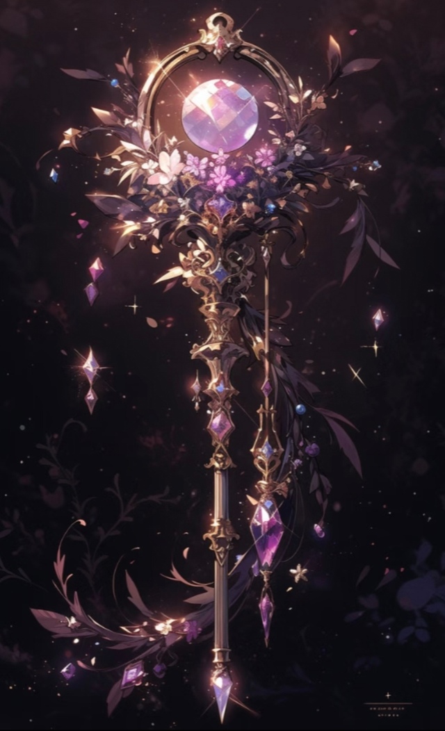 元犀神杖:暗夜花境中绽放的法杖,紫金雕花缠绕着,紫晶的梦幻光晕,花簇与宝石在幽暗中,织锦神秘图腾,低语花之秘境的魔咒,似能唤醒沉睡于,夜色里的浪漫魔法。