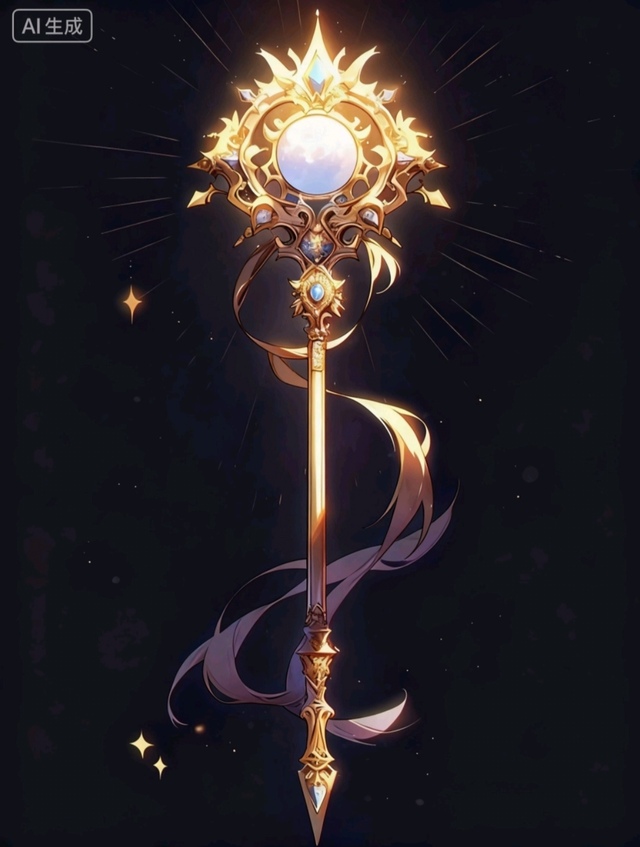 圣阳法杖:从神谕中诞生的权杖,金芒如日光织就华丽纹路,那里镶嵌着圆形的白玉石,宛如朝霞般的色彩,宝石似星子嵌于杖身,丝带在暗穹下,流转成神圣的光晕,散发着柔和的光芒,集合坚定与正义的力量,代表追求真相和公平的决心。