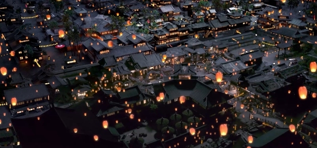 若是俯瞰,便能知道屋舍错落。灯火与天灯交织,织就一幅绚丽长卷。