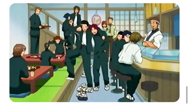 原来寿司店是河村爸爸开的,听说比赛赢了专门关了店给大家庆祝,虽说刚开始不是很乐意,但没一会儿龙马就沉浸在寿司的美味里了
