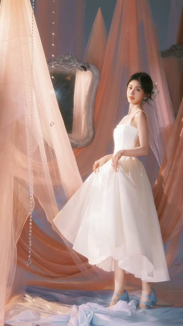 白色丝绸礼服顺着她的身形垂落,宛若月光凝成的瀑布。