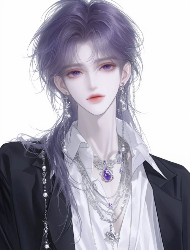 幻糜的耳朵上挂着一对精致的银色耳坠,耳坠上镶嵌着细小的宝石,随着他的每一个动作轻轻摇曳,发出悦耳的铃铛声。他的脖子上戴着一条由银色和紫色宝石交织而成的项链,中央镶嵌着一颗巨大的紫色宝石,散发着神秘的光芒,仿佛是白月曦的化身。