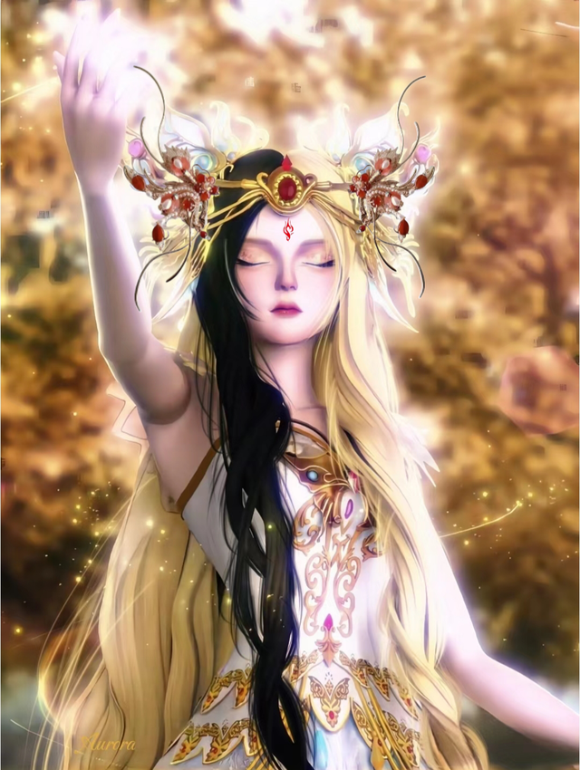 她身着一袭白色的长袍,袍子上绣着金色的花纹,显得既高贵又神秘。长袍的边缘装饰着蓝色的流苏,随着她的动作轻轻摇曳。她的头饰异常华丽,由金色和红色组成的珠钗,中间点缀着一颗璀璨的红宝石,仿佛是夜空中最亮的星星。